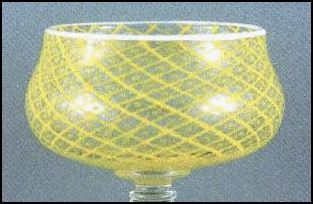 The cup is made from 48 pieces of cane, glass stretched to1/3 of the diameter of a pencil. Twenty-four pieces are laid next to each other and heat to 1225F. When ready they are rolled up into a tube on a blowpipe, twisted clockwise, made into a cup then it's kept ready at 1025F .